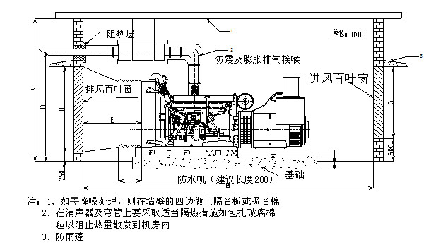 c.为了降低机房温度,排烟管道应用隔热材料包扎;如果允许的话,尽可能将消声器及大部分排烟管安排在机房外。