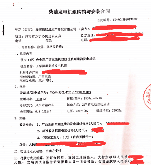 我司与万宁浩铭房地产公司签订200KW发电机组合同