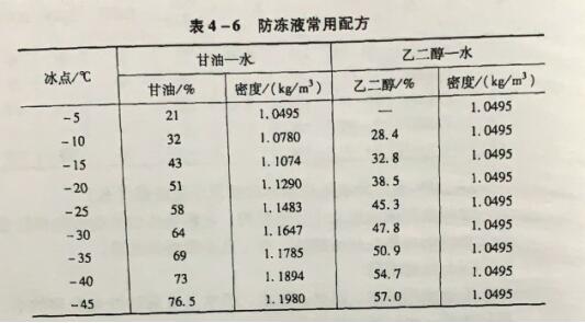 水的凝固点即结冰的温度,在冬季里柴油机长时间停车时,温度下降可能使冷却水结冰,造成零件冻裂事故。因此冬季柴油机长时间停车时,必须将冷却系统内的冷却水放掉。严寒地区,为了防止柴油机冬季使用过程中零件冻裂事故的发生,又减少放水工作,可以配制防冻液作为冷却介质,防冻液的常用配方如表4-6所示。